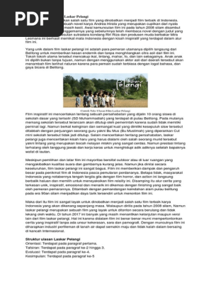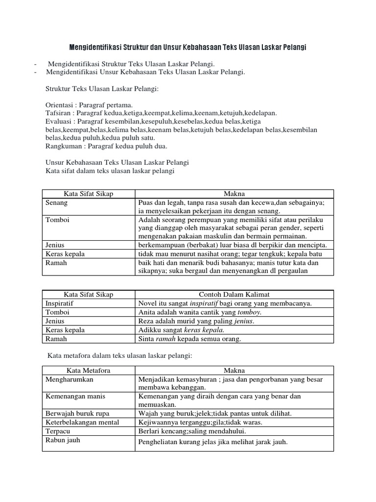 Novel (hujan), buku pelajaran, film, drama persahabatan, dsb. Itulah yang dapat admin kumpulkan terkait struktur teks ulasan laskar pelangi tafsiran. Novel ini bercerita tentang kehidupan 10 anak dari keluarga miskin yang bersekolah (sd dan smp) di sebuah sekolah muhammadiyah di pulau belitong yang penuh dengan keterbatasan. Keterbatasan yang ada tak memuat anggota laskar pelangi putus asa, tetapi membuat mereka terpacu untuk bisa melakukan sesuatu yang lebih baik.cerita terjadi di desa gantung, belitung timur yang dimulai saat sd muhammadiyyah terancam akan dibubarkan oleh depdikbud sumsel jika tak melebihi 10 anak. Setelah sebelumnya telah membahas secara tuntas terkait materi teks ulasan, kini saatnya kita melihat beberapa contoh dari teks ulasan itu sendiri sesuai dengan strukturnya yang baik dan benar.
