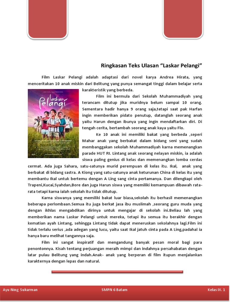 Buatlah contoh teks ulasan laskar pelangi; Contoh teks ulasan singkat drama, cerpen, buku, film, puisi, dan novel laskar pelangi beserta penjelasan mengenai strukturnya ada lengkap disini. Nah, agar anda bisa membedakan teks ulasan dengan teks lainnya, simak strukturnya dibawah ini. Teks ulasan film 'perahu kertas' 7. Contoh teks ulasan beserta strukturnya. Dalam beberapa kasus teks ulasan juga sering digunakan untuk mengulas beberapa produk berupa barang. Teks ulasan buku 'cinta brontosaurus' 3. Novel (hujan), buku pelajaran, film, drama persahabatan, dsb. Urutan teks tersebut agar menjadi teks ulasan yang baik adalah (3) film laskar pelangi layak disebut sebagai salah satu film terbaik indonesia sepanjang masa. Itulah yang dapat admin kumpulkan terkait struktur teks ulasan laskar pelangi tafsiran. Struktur teks ulasan laskar pelangi orientasi : Berikut informasi sepenuhnya tentang novel laskar pelangi beserta strukturnya. Contoh teks ulasan tentang novel laskar pelangi.