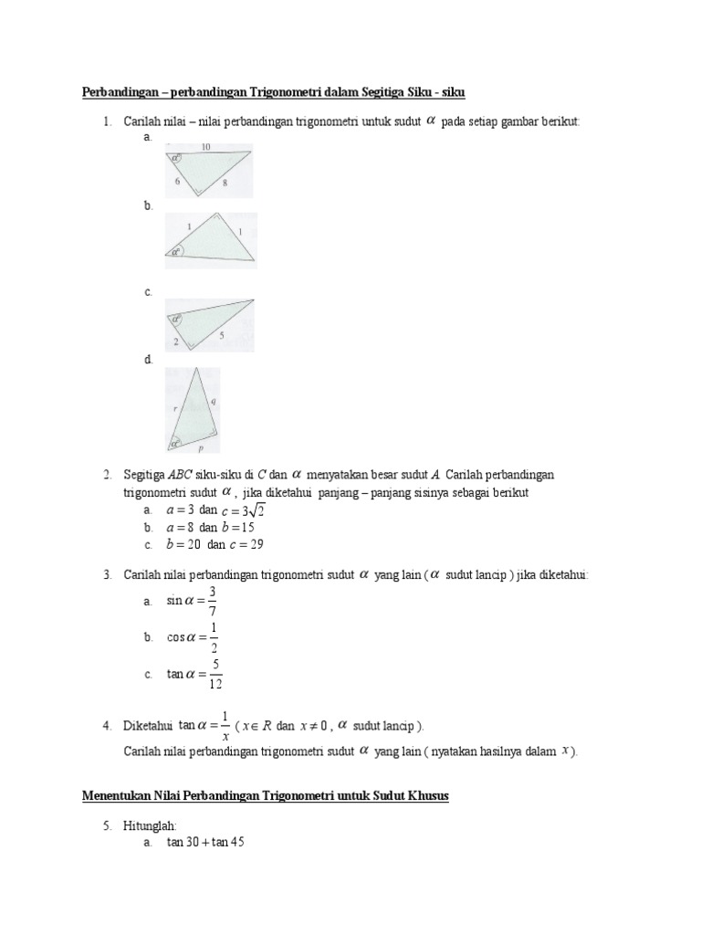 Jadi, nilai perbandingan trigonometri untuk sudut pada gambar tersebut adalah: 2 sqrt 5 12 2 2. Sin 600 cotg 600 + sec 450 cos 450 b. Berikut ini adalah nilai perbandingan trigonometri sudut sudut istimewa tersebut. Ukuran sudut umumnya, ada dua jenis ukuran yang digunakan untuk menentukan besar suatu sudut, yaitu radian ( rad ) dan derajat ( ° ). Agar lebih jelas dalam penerapannya, simak pembahasan berikut. Kali ini, disediakan soal dan pembahasan mengenai perbandingan trigonometri bagian dasar (pengenalan) dengan cakupan tentang konsep sudut dan penggunaan perbandingan trigonometri, yakni sinus, cosinus, tangen, secan, cosecan, dan cotangen. 11ka p sudut lancip, tentukan nilai perbandingan trigonometri sudut p yang lain, jika salah satu nilai perbandingan trigonometri sudut diketahui. 12 16 20 q q a. Untuk memahami perbandingan trigonometri, simak pembahasan dibawah ini Sedangkan untuk di kuadran ii, iii, dan iv hanya. Jika p sudut lancip, tentukan nilai perbandingan trigonometri sudut p yang lain, jika salah satu nilai perbandingan trigonometri sudut diketahui. Jika p sudut lancip, tentukan nilai perbandingan trigonometri sudut p yang lain, jika salah satu nilai perbandingan trigonometri sudut diketahui.